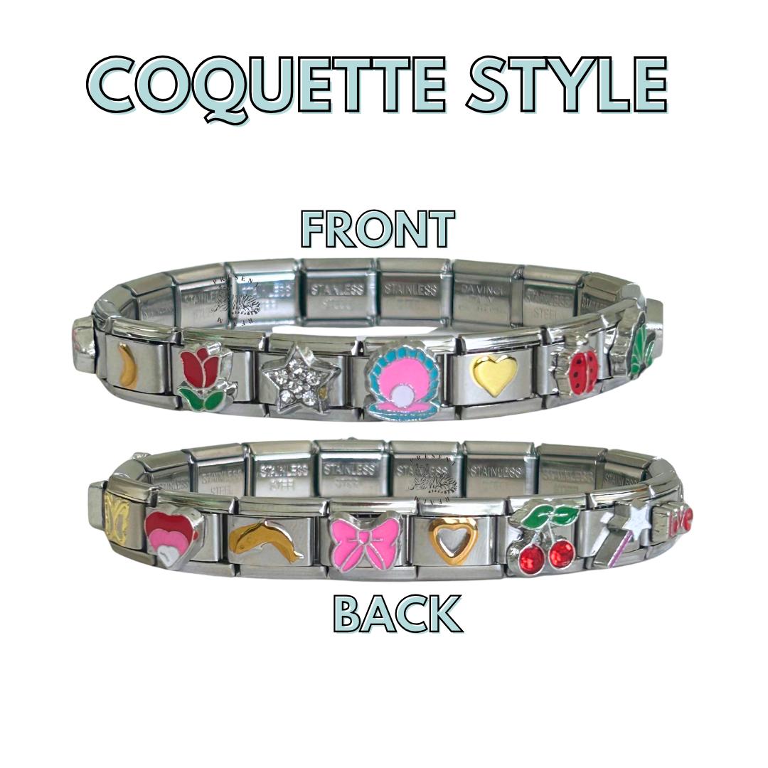 Soft, romantic, and effortlessly elegant, our Coquette Style Italian Charm Bracelet is a ready-to-wear set featuring 18 hand-selected coquette-inspired charms. Perfect for those who adore bows, hearts, and vintage aesthetics, this bracelet is designed to complement soft, dreamy, and preppy fashion trends.