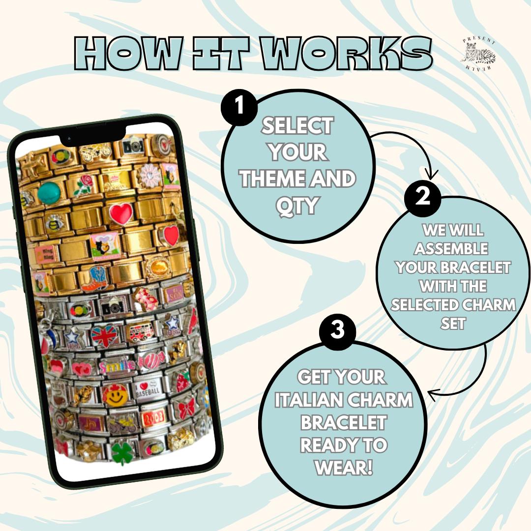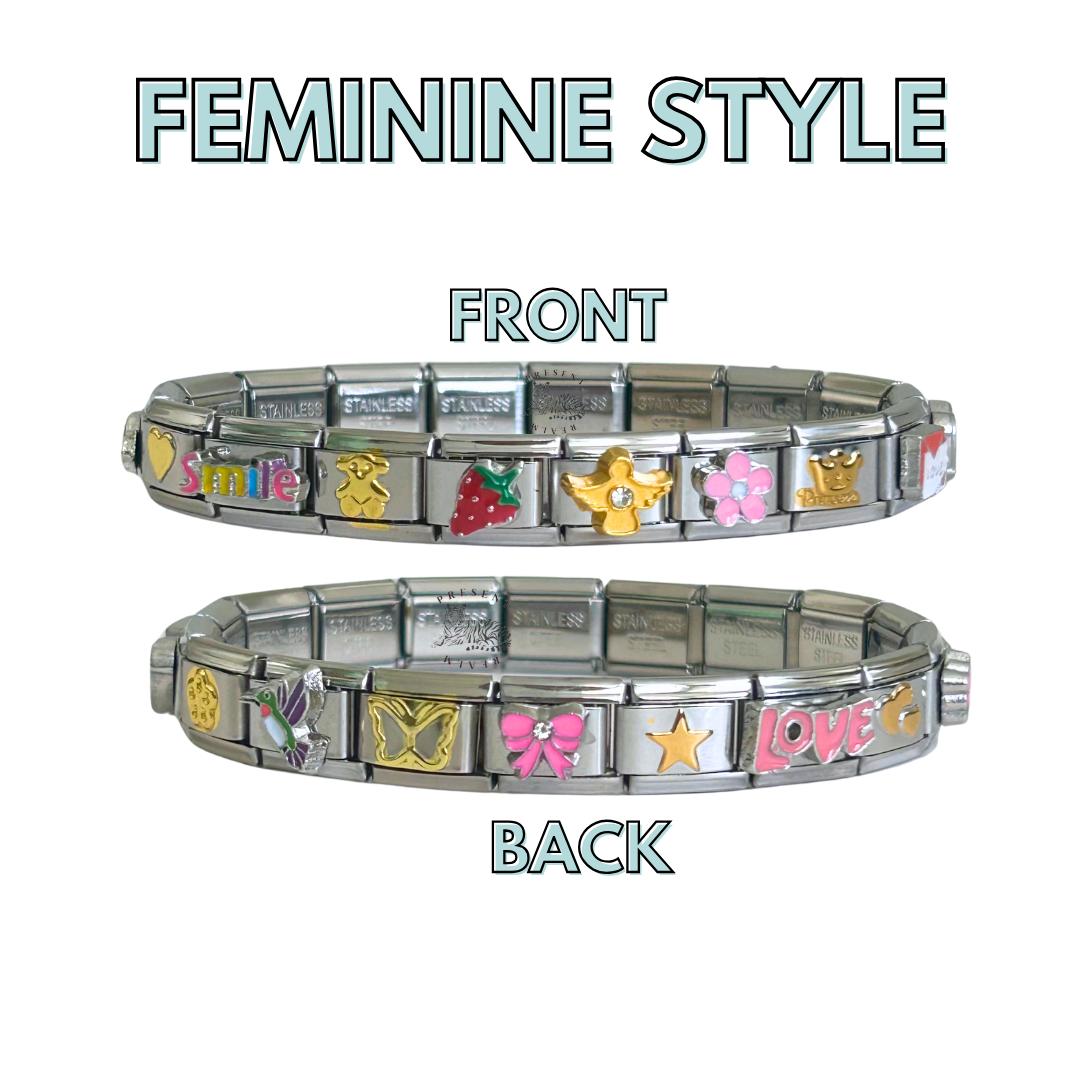 Celebrate all things fun, cute, and stylish with our Feminine Style Italian Charm Bracelet—a ready-to-wear set featuring 18 hand-selected girly charms. Whether you love pastel colors, floral designs, or playful and cute charms, this bracelet is the perfect everyday accessory.